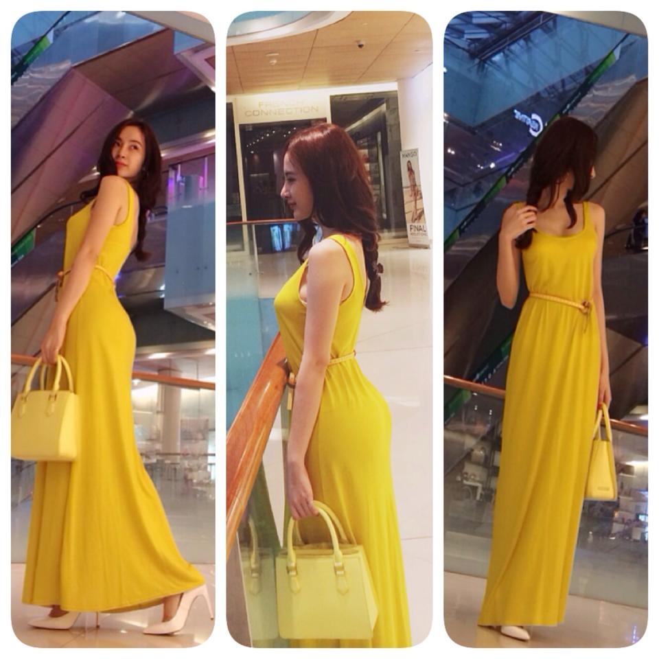 | Đối lập với hình ảnh cá tính của Chi Pu, ''nữ hoàng thị phi'' diện bộ váy ôm dáng khi có buổi shopping tại trung tâm thương mại lớn tại TP.HCM. Bộ váy tông vàng được khen ngợi là hợp phong cách và vóc dáng người mặc. Phụ kiện túi xách, thắt lưng đi kèm đồng sắc độ ăn ý. |