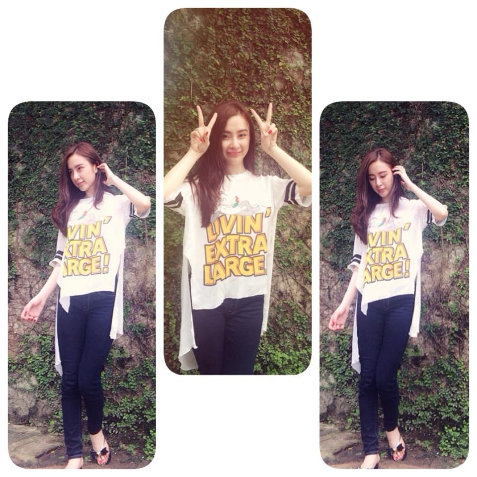 Một ngày khác, Phương Trinh diện bộ áo thun vạt ngắn dài cùng quần jeans tối màu, chân đi giày xỏ ngón đế bệt khá đời thường và bình dân.