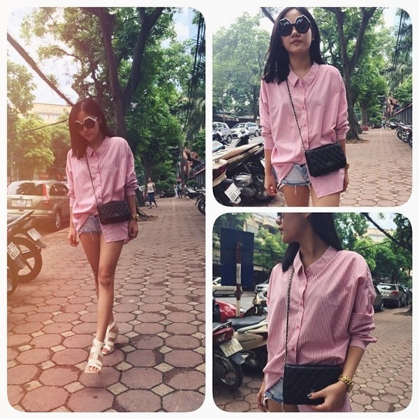 Văn Mai Hương duy trì hình ảnh thời trang đậm cá tính với áo sơ-mi sọc kẻ, quần shorts ngắn và giày sandals mạnh mẽ. Phụ kiện túi xách, kính râm hình lập giác mix ăn ý cùng phong cách.