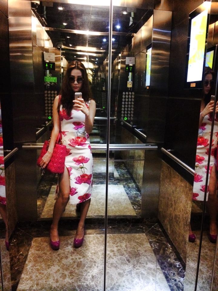 Diễm My 9X khoe dáng chuẩn trong bộ váy ôm sát, in họa tiết hoa cúc hợp xu hướng. Bộ cánh tôn vóc dáng người mặc nhờ điểm nhấn xẻ cao gợi cảm. Kết hợp cùng trang phục hợp dáng, nữ diễn viên mang túi hiệu Dior và giày cao gót gam tím.