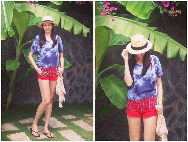 Hoa hậu thời trang Trúc Diễm trông năng động và hiện đại khi diện áo thun boho tua rua cá tính, quần shorts tông màu đỏ nổi bật khi cùng bạn trai du lịch tại Mũi Né.