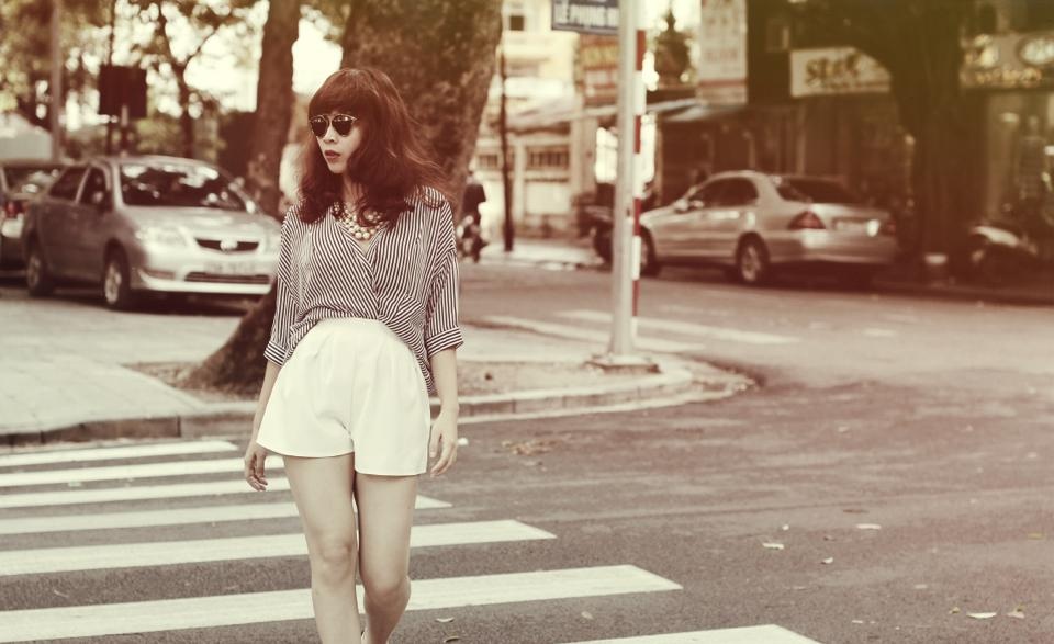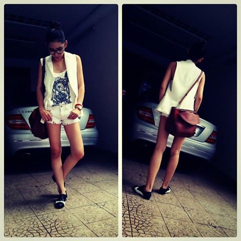 Người mẫu Bắc Linh nổi bật trên phố với set trang phục ''cây'' trắng hợp thời trang. Quần shorts denim rách phối ăn ý cùng áo thun họa tiết, áo vest không tay.