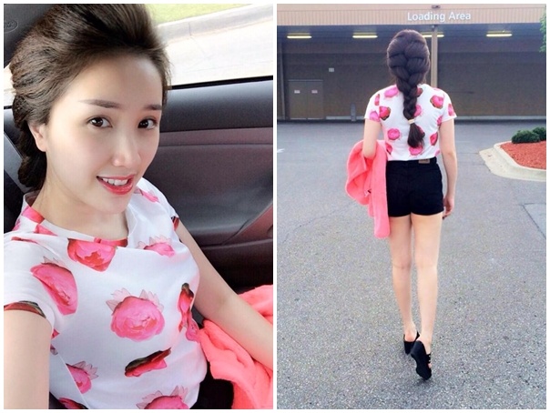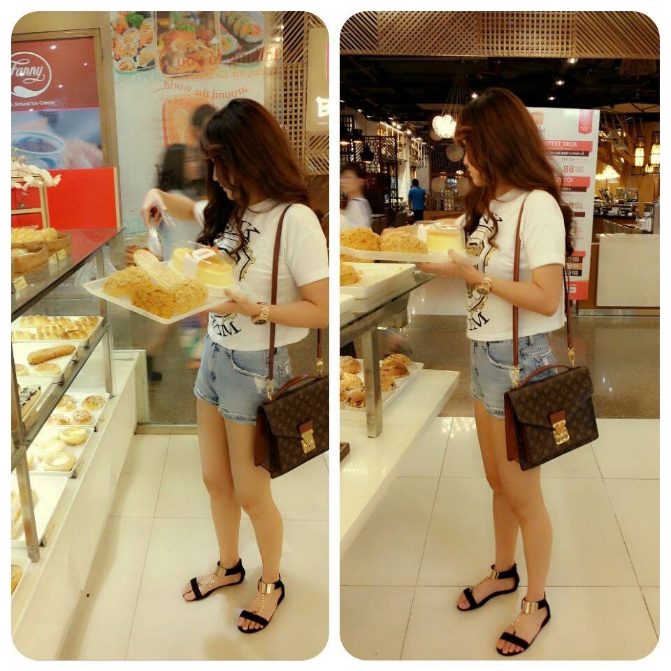 Nữ ca sĩ Bùi Bích Phương trông năng động với áo thun, quần shorts, giày đế bệt hiện đại khi hẹn hò bạn bè cuối tuần.