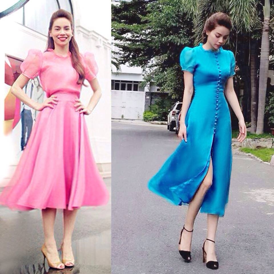Bà mẹ một con Hồ Ngọc Hà nổi bật trên phố với bộ váy phong cách cổ điển, nữ tính. Hai tông màu hồng ngọt ngào và xanh tươi mát vừa vặn và phù hợp phong cách của ''nữ hoàng giải trí''.