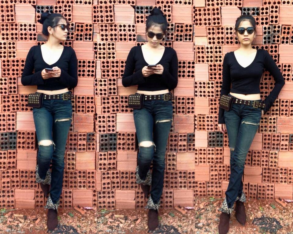 Á hậu Trương Thị May mang đến cái nhìn mới lạ khi diện bộ trang phục tối màu, quần jeans xé cá tính mix ăn ý cùng áo thun crop-top hiện đại.