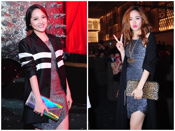 | Đến ủng hộ Hồ Ngọc Hà ra mắt liveshow kỷ niệm 10 năm ca hát, ca sĩ Minh Hằng và Bảo Anh vô tình diện chung một mẫu thiết kế giống nhau như đúc, chỉ khác về cách phối. Giọng ca Sắc môi em hồng chọn phong cách nữ tính khi mix kèm áo khoác cardigan dáng dài, phụ kiện vòng cổ trẻ trung và túi da báo hợp mốt, trong khi đó, nữ ca sĩ The Voice mặc thêm áo khoác thể thao mạnh mẽ, mái tóc "đuôi gà" năng động. |