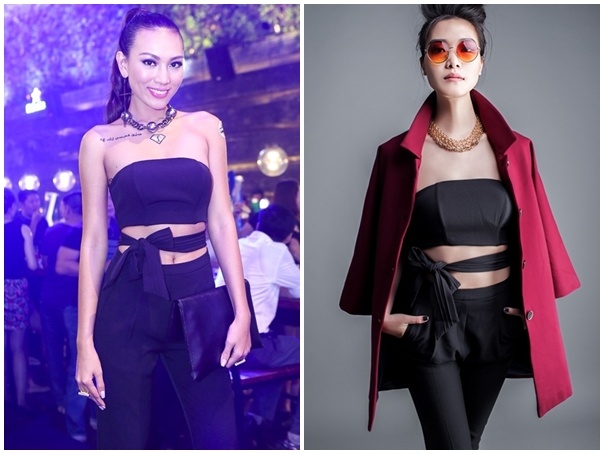 | Hoa hậu Thùy Dung "đụng hàng" thiết kế mà Diệu Huyền từng mặc khi cô tham dự một sự kiện giải trí, còn Hoa hậu Việt Nam 2009 diện khi thể hiện bộ ảnh thời trang mới. Vóc dáng hoàn hảo và cách mix phụ kiện khác nhau mang lại cái nhìn mới mẻ cho hai nữ chủ nhân. |