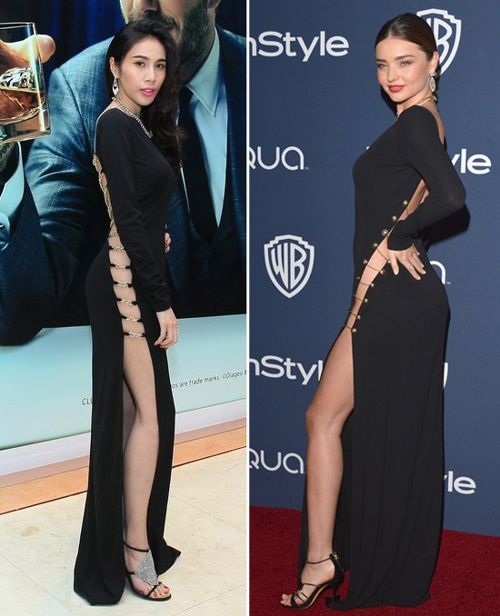 Trong sự kiện đón tiếp danh thủ David Beckham sang thăm Việt Nam, giọng ca Kiss me diện lại mẫu váy gợi cảm táo bạo mà "thiên thần nội y" Miranda Kerr từng mặc. Tuy nhiên, thiết kế có nhiều điểm khác biệt khiến bà xã Công Vinh bị nghi ngờ diện trang phục hàng nhái.