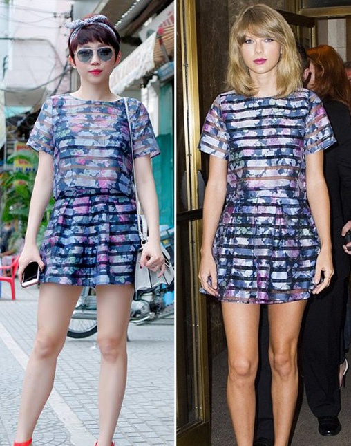 Tóc Tiên tự tin diện lại thiết kế họa tiết hoa mùa hè mà Taylor Swift mặc từ cách đó khá lâu. Nữ ca sĩ người Việt nổi bật nhờ làn da trắng hồng và phụ kiện mix kèm trẻ trung.