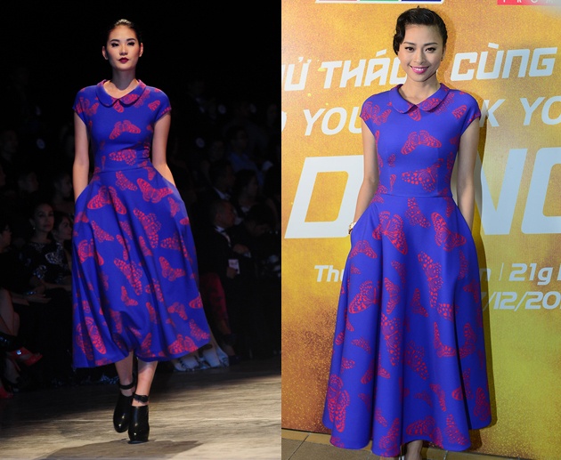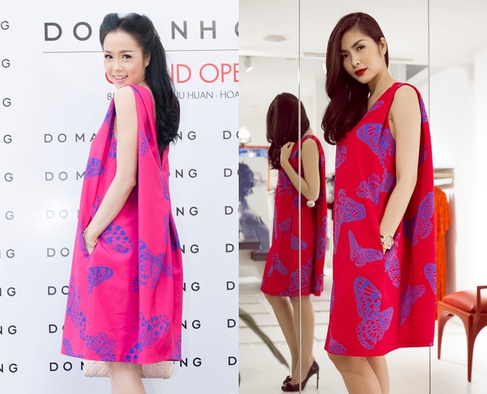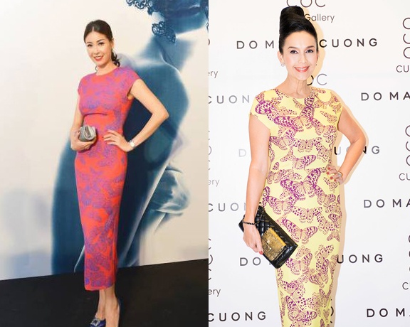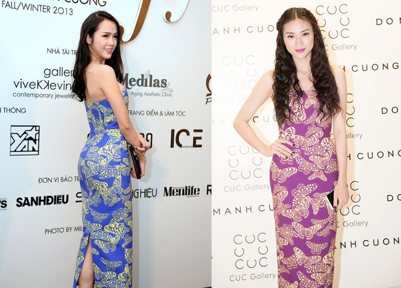 Nhiều mỹ nhân showbiz Việt ưa chuộng những mẫu váy ''Những cánh bướm cuối thu'' của NTK Đỗ Mạnh Cường, vì thế không tránh khỏi nhiều trường hợp ''đụng hàng'' khi tham dự các sự kiện giải trí.