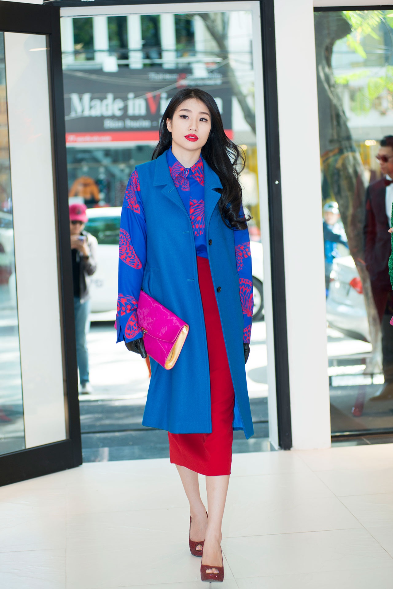 Quán quân Huyền Trang cá tính với cách phối quần dáng suôn in họa tiết và áo tông màu đỏ bắt mắt. Thời gian vừa qua, Huyền Trang thường góp mặt trong những sự kiện của giám khảo Vietnam's Next Top Model. Đây cũng là dấu hiệu cho thấy mối quan hệ của cả hai được cải thiện hơn trước.