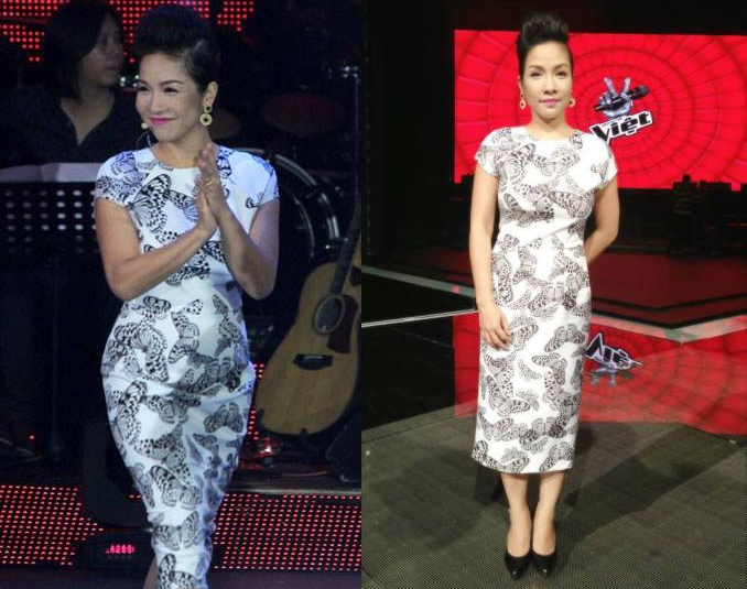 Tiếp đó, nữ ca sĩ Mỹ Linh mạnh dạn diện lại thiết kế này khi ngồi ghế nóng chương trình The Voice. Mẫu váy có gam màu trắng, họa tiết in được cách điệu sáng tạo và in trên nền vải trơn khá thuận mắt. Dù vóc người cao ráo như Lê Thúy hay đậm đà như Mỹ Linh, kiểu váy đều dễ dàng linh hoạt phù hợp và không làm lộ khuyết điểm cơ thể người mặc.