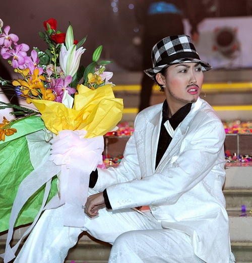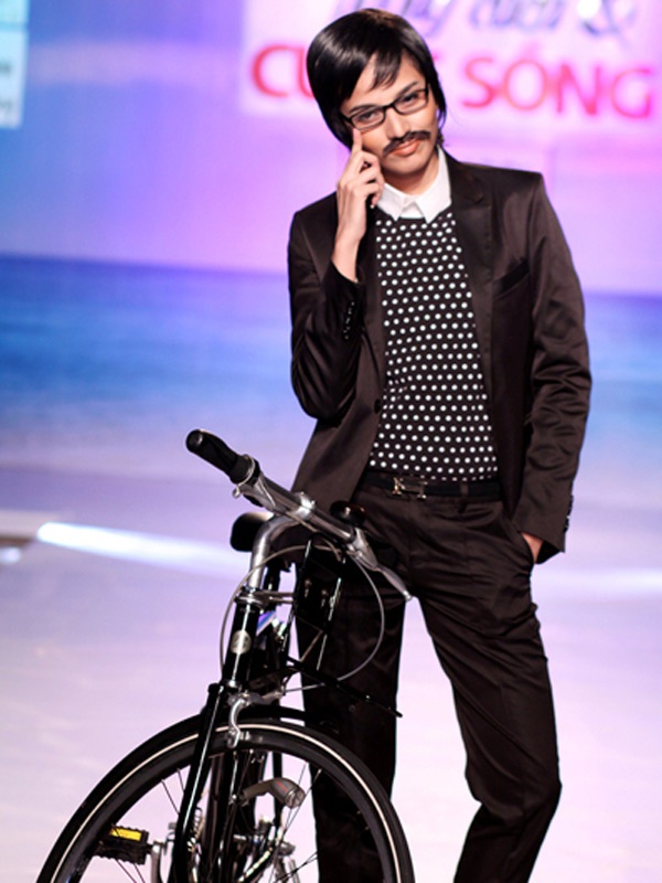 | Trong một chương trình, người đẹp dao kéo đã hóa thân làm chàng trai mạnh mẽ và lãng tử. Bộ vest trắng cùng mũ phớt và bộ râu giúp Phi Thanh Vân được chú ý nhiều hơn. |