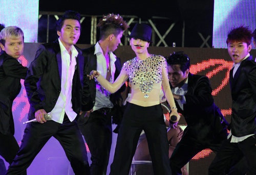 Luôn mang đến những bất ngờ trên sân khấu âm nhạc, Yến Trang chọn giả trai để tạo sức hấp dẫn cho tiết mục biểu diễn. Trong bộ trang phục ôm sát, khuôn mặt của Én chị thêm phần lạnh lùng, cá tính nhờ sự hỗ trợ của bộ râu giả.