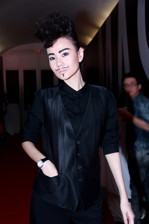 | Dương Yến Ngọc từng gây ấn tượng với phong cách trang điểm nam tính và mạnh mẽ. Bộ ria mép được tô vẻ tỉ mỉ giúp cô trở thành tâm điểm của buổi tiệc. |