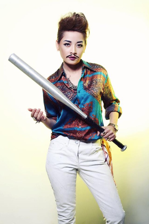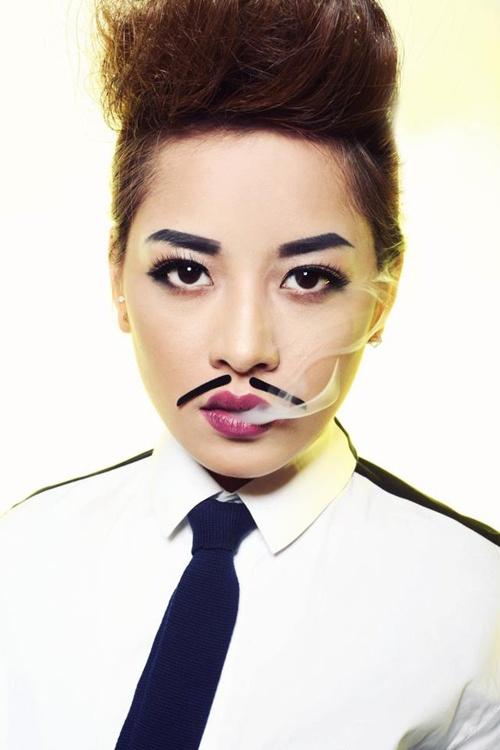Hot girl Chi Pu không ngần ngại biến hóa với hình ảnh nam tính. Nữ người mẫu tuổi teen diện trang phục vest in hoa, mái tóc chải ngược dựng thẳng mạnh mẽ. Táo bạo hơn khi khuôn mặt cô còn được gắn thêm bộ ria mép rất đậm.