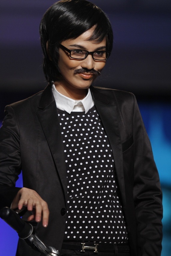 | Người đẹp mặc vest, dán râu giả hóa trang làm một người mẫu nam, sải bước tự tin, mạnh mẽ trong một chương trình thời trang. |