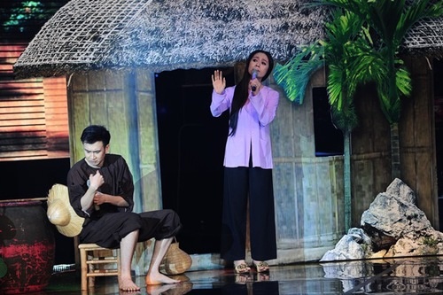 | Thanh Thúy cũng trở nên mộc mạc khi biểu diễn Ru lại câu hò cùng Dương Triệu Vũ trên sân khấu Cặp đôi hoàn hảo. |