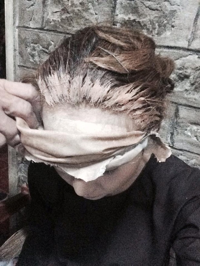 | Mái tóc bết dính mỹ phẩm, hóa chất của Ngân Khánh mỗi lần hóa trang. |