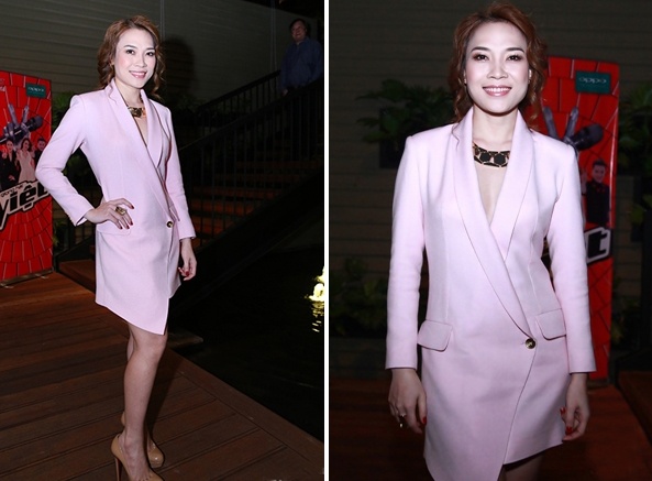 | Gam hồng nhạt pastel hay còn gọi là hồng phấn là một trong những tông màu được yêu thích ở mùa hè 2015. Trong buổi họp báo giới thiệu mùa giải mới, "họa mi tóc nâu" khéo chọn bộ cánh hợp ngoại hình. Thiết kế vest cổ chữ V sâu, vạt chéo và tông màu pastel hài hòa nâng tầm hình ảnh cho giọng ca gốc Đà Nẵng. |