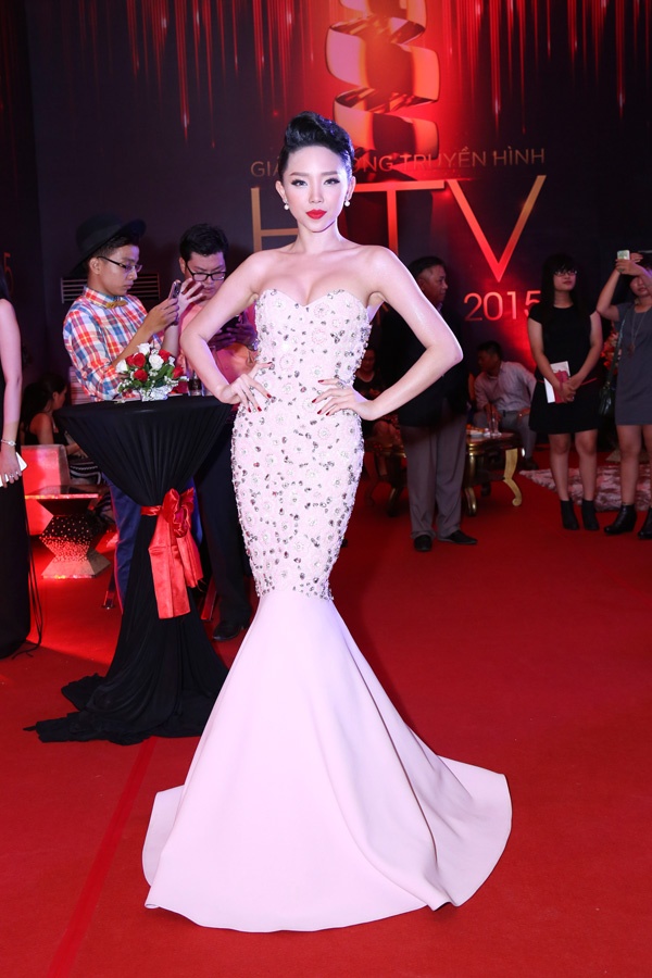 | Khác với tính chất nhã nhặn, nhẹ nhàng, Tóc Tiên dùng gam hồng với phong cách gợi cảm. Thiết kế dạ hội đuôi cá của Lý Quí Khánh vừa vặn với dáng người đầy đặn của giọng ca Ngày mai. |