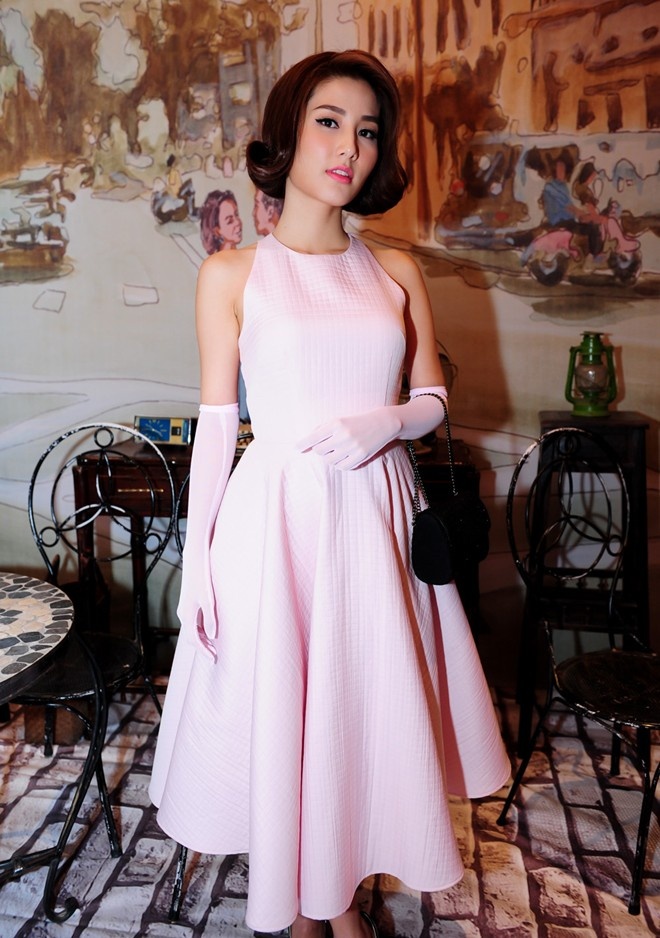 Diễm My hóa thành quý cô Sài thành những năm 1950 - 1960 từ trang phục đến kiểu tóc, găng tay. Nữ diễn viên Tốc độ và đường cong trông duyên dáng hơn nhờ tông màu tao nhã, phù hợp vẻ đẹp nữ tính vốn có.