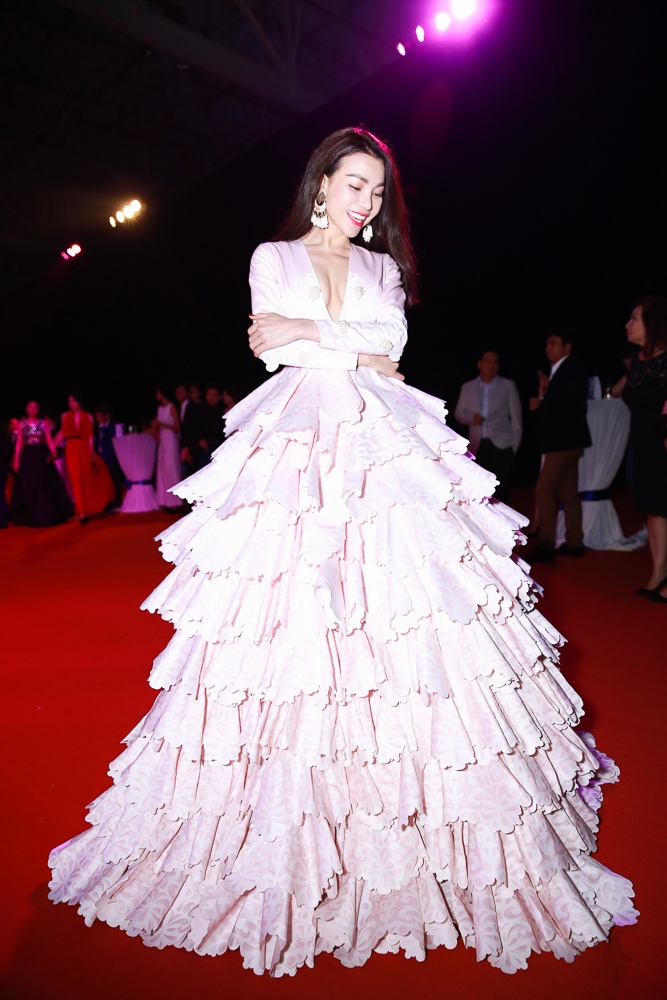 | Trà Ngọc Hằng nổi bật với trang phục quý phái, được thiết kế bởi Lý Quí Khánh. Bộ cánh giúp người đẹp tạo sự khác biệt giữa dàn mỹ nhân Vbiz có tông màu trắng hồng nhã nhặn, được xếp tầng bồng bềnh lãng mạn. |