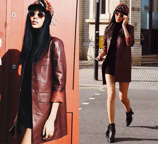 Thời trang áo da luôn là nguồn cảm hứng bất tận cho các nhà thiết kế thời trang. Qua mỗi mùa, xu hướng áo da đều mang nét đẹp riêng biệt và cuốn hút khó cưỡng. Chính bởi vậy, các tín đồ thời trang trên thế giới, kể cả những ngôi sao thường xuyên diện áo khoác da khi ngày lạnh về. Siêu mẫu Hoàng Thuỳ nổi bật trên phố với set đồ hoàn hảo của váy bên trong, áo khoác da dáng dài, bốt ngắn cổ và mũ lạ mắt.