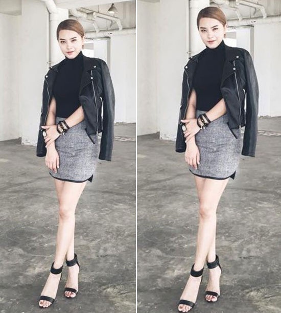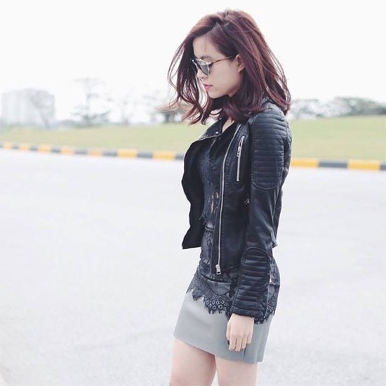 | Ưu điểm của áo khoác da là khỏe khoắn, cá tính lại sang trọng và rất dễ mặc. Trang Khiếu chọn cho mình chiếc áo da cá tính và kết hợp ăn ý với bộ đôi crop top + chân váy. Trang phục giúp cô tôn được chiều cao lý tưởng và vóc dáng mảnh dẻ. |