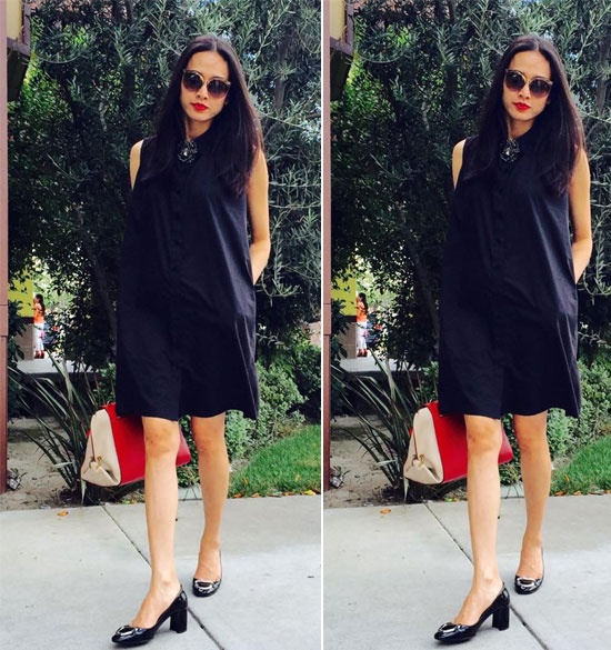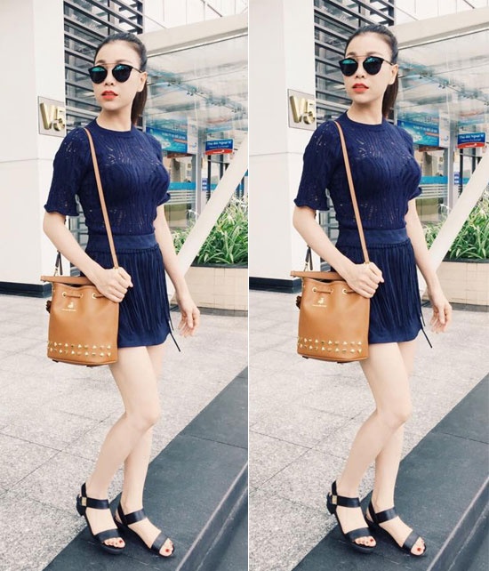 | Trà Ngọc Hằng ra phố ngày đầu thu với bộ đồ đen kiểu dáng trẻ trung. Túi đeo vai màu be và sandals đen phù hợp với trang phục tạo nên nét sành điệu, thời thượng. |