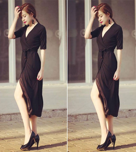 | Hoàng Thùy Linh khoe vóc dáng mảnh dẻ và làn da trắng ngần trong bộ váy đen chất liệu mềm mại, xẻ đùi, cổ chữ V. Đôi môi được trang điểm màu đỏ khiến cô cuốn hút và sắc nét. |