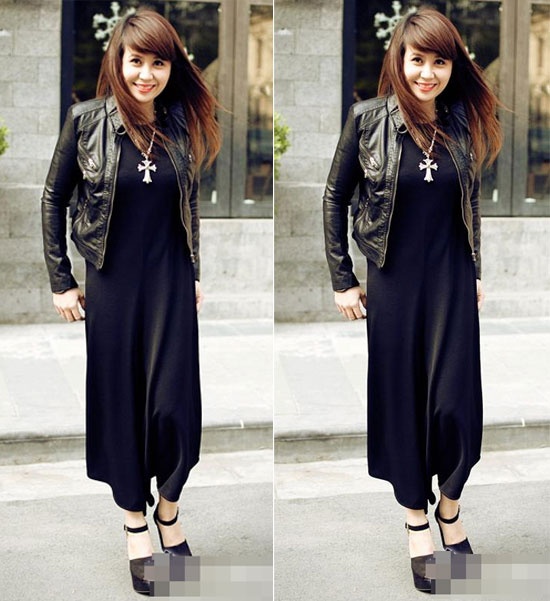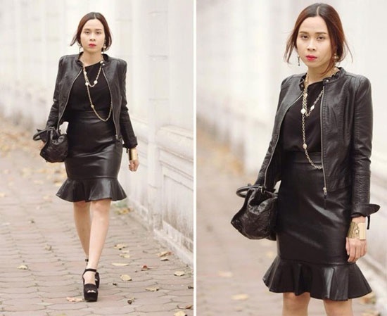 Áo khoác da được Lưu Thiên Hương "làm mới" khi kết hợp với váy dài thướt