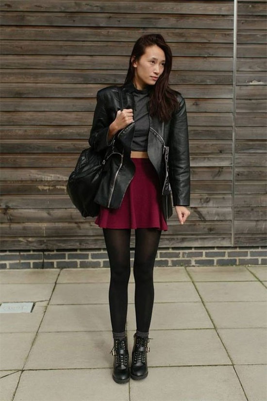 áo da lửng kết hợp váy mini, váy loe như Hoàng Thùy Linh. |