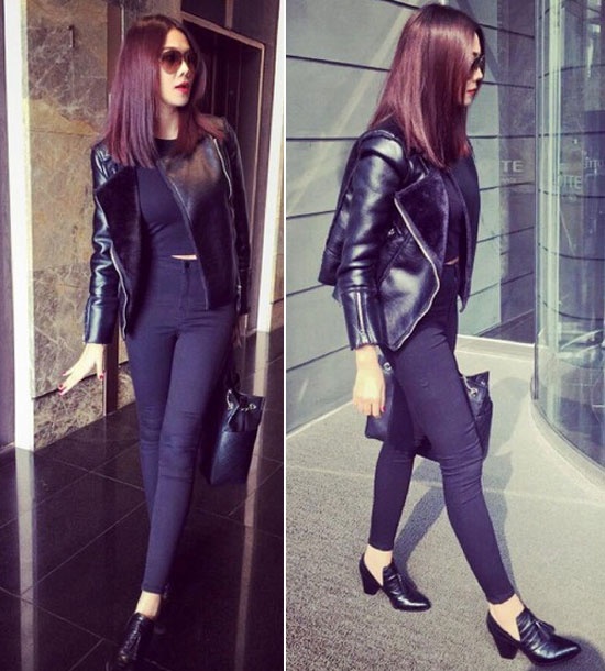 | Thanh Hằng diện "cả cây" đen với áo khoác da lửng "cực chất". |