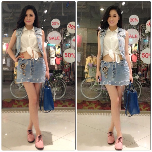 | Victoria Phương Nguyễn nổi bật với cách phối chất liệu denim, trang phục hiện đại hơn khi áo sơ mi được thắt vạt khoe vòng 2 gợi cảm, giày oxford tông màu hồng nữ tính, túi Dior gam xanh trị giá gần 100 triệu luôn mang bên mình. |