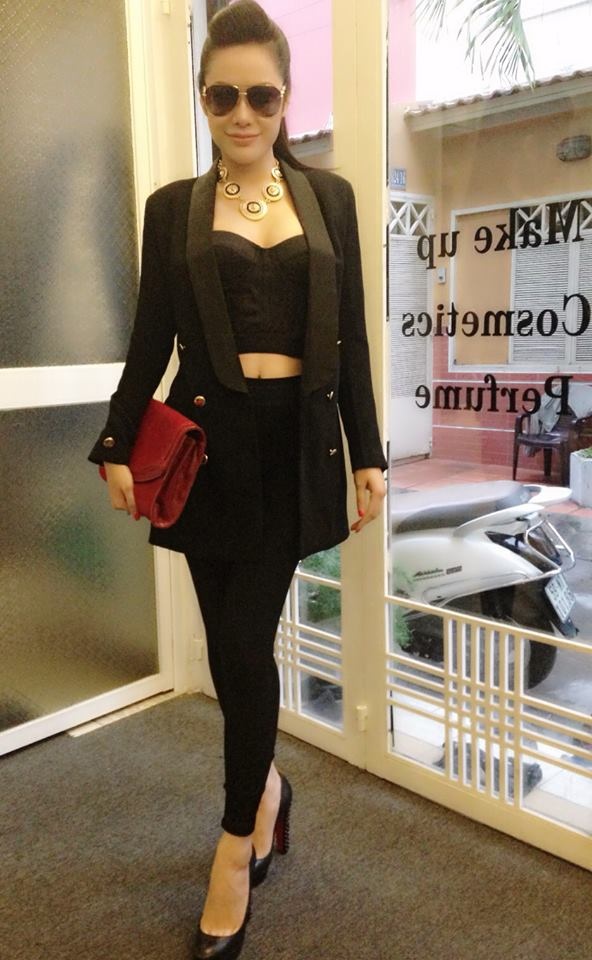 Victoria Phương Nguyễn chứng tỏ gu thời trang đa dạng với bộ cánh tông đen, quần ôm sát, áo croptop