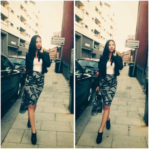 | Tham gia show diễn của NTK Hoàng Hải tại London, Minh Triệu tranh thủ thời gian rảnh rỗi để shopping trên những con phố tấp nập, cô diện trang phục khá thanh lịch, chân váy bút chì kết hợp cùng áo thun trắng, jacket khoác nhẹ bên ngoài rất hiện đại. |