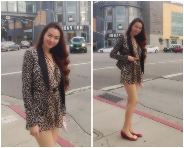 Nữ diễn viên Váy hồng tầng 24 diện trang phục họa tiết da báo đồng tông, kết hợp giày đế bệt khi đang dạo phố.