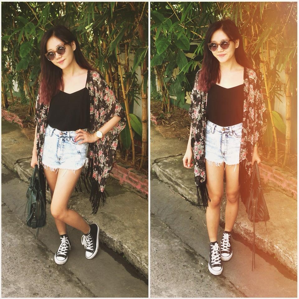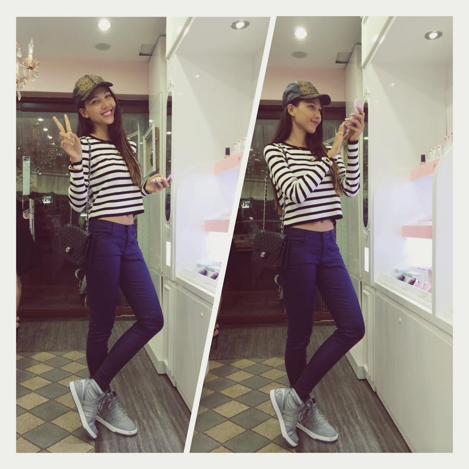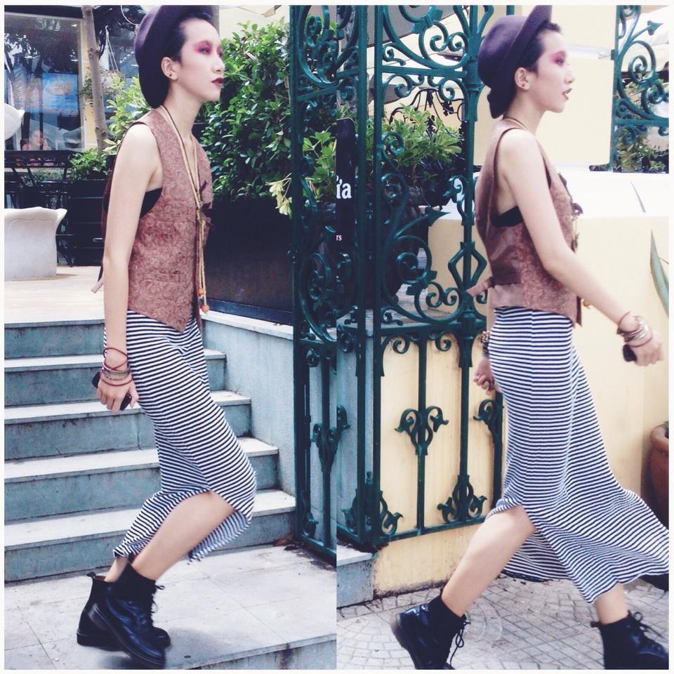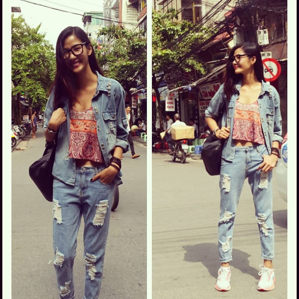 Khi xuống phố, quán quân Vietnam's Next Top Model Hoàng Thùy chuộng gu cá tính, bụi phủi. Cô trông khỏe khoắn khi mặc quần jeans rách kết hợp cùng áo dây họa tiết và áo khoác jacket chất liệu denim ăn nhập tổng thể.
