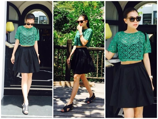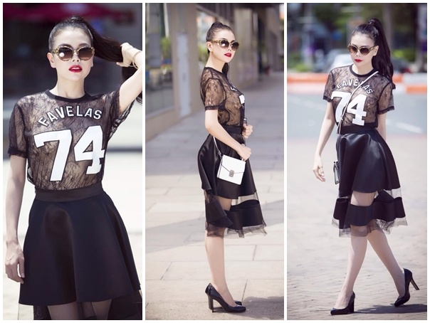 Một ngày khác, nữ ca sĩ mix trang phục tông đen trắng rất ăn ý. Cô diện áo số chất vải xuyên thấu, kết hợp cùng chân váy chất liệu da, voan mỏng tinh tế. Trang phục đẹp khiến chân dài tự tin khi thả bộ trên con phố trung tâm Sài Gòn.