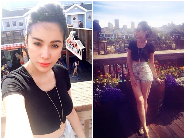 Ca sĩ Tóc Tiên nổi bật trên đường phố New York khi có chuyến du lịch ngắn ngày. Cô vận trang phục áo thun, quần vải thô, sandals năng động, tiện lợi cho việc di chuyển nhiều.