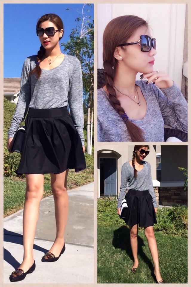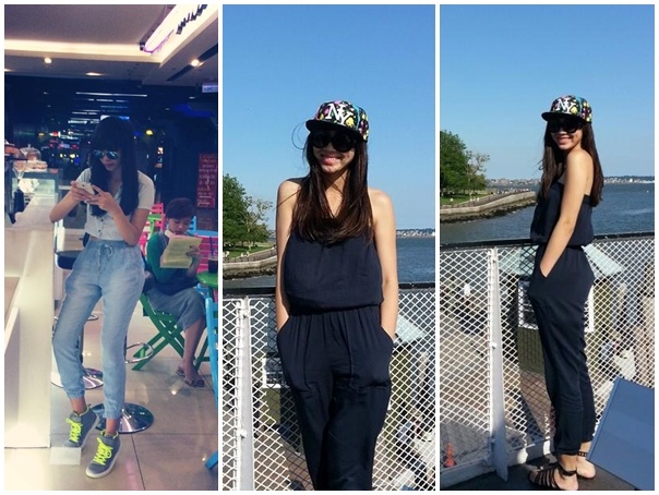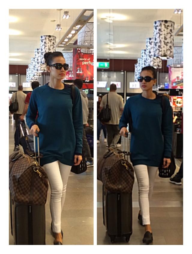 | Trong một chuyến du lịch, người mẫu Huỳnh Nu chọn những bộ cánh đơn giản, gam màu tối kết hợp ăn ý. |