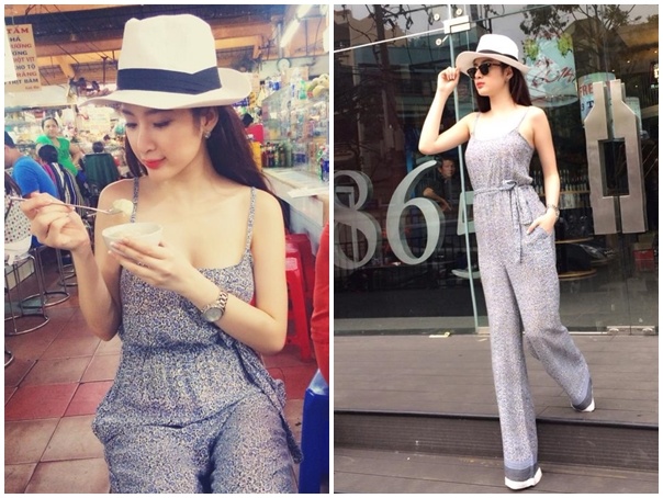 Bộ jumpsuit tông màu trầm, chất vải voan nhẹ, mũ fedora rộng vành giúp Phương Trinh nổi bật trên phố.