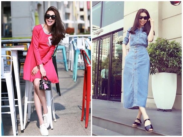 | Trà Ngọc Hằng chọn phong cách tươi trẻ và cổ điển đối lập. Chất liệu denim, thun được nữ người mẫu ưu ái. |