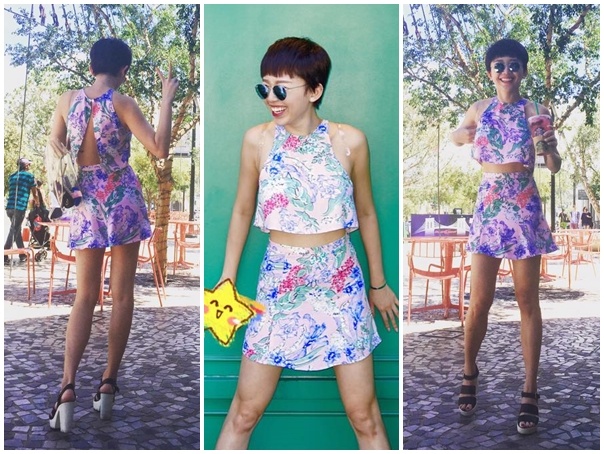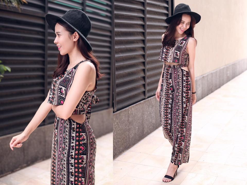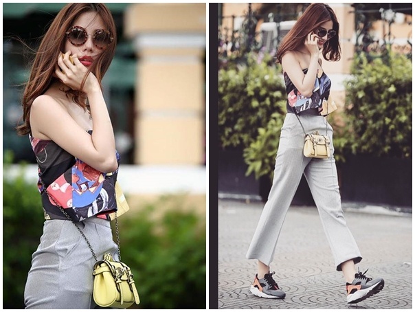 | Trong khi đó, Diễm My 9X cũng hướng đến hình ảnh gợi cảm. Người đẹp diện mốt áo quây họa tiết, kết hợp cùng quần lửng suông thoải mái đi bộ. |