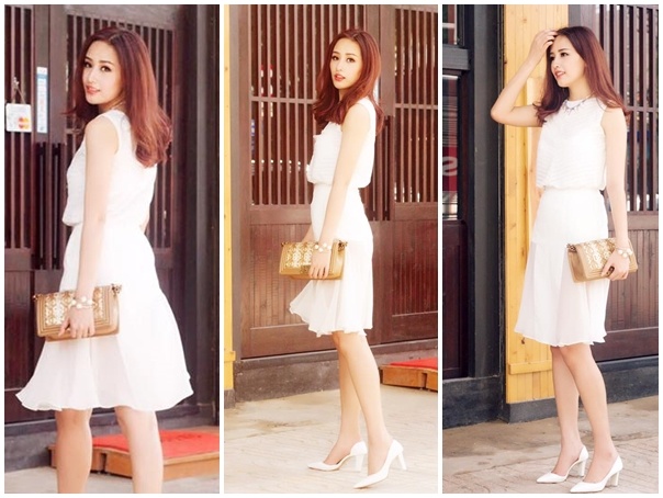 | Mai Phương Thúy khoe nét tinh khôi, đáng yêu khi xuống phố vào chiều thứ 7 với trang phục sắc trắng, phụ kiện đồng màu. |
