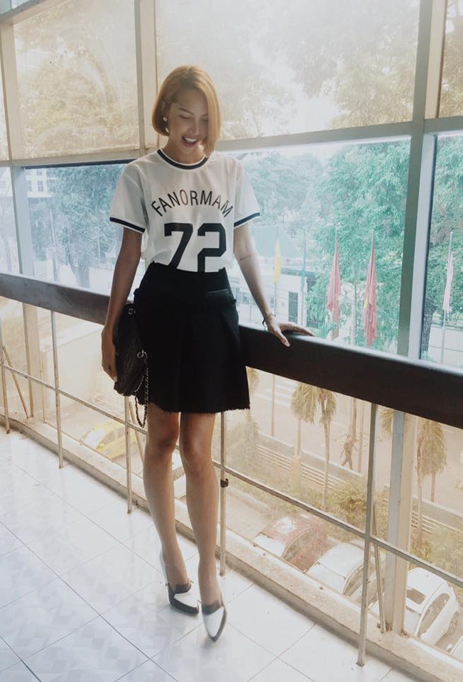 | Minh Triệu cá tính trong set trang phục áo thun phong cách thể thao có họa tiết chữ số, kết hợp ăn nhập cùng chân váy tối màu và giày cổ điển trắng đen tiệp sắc độ tổng thể. |