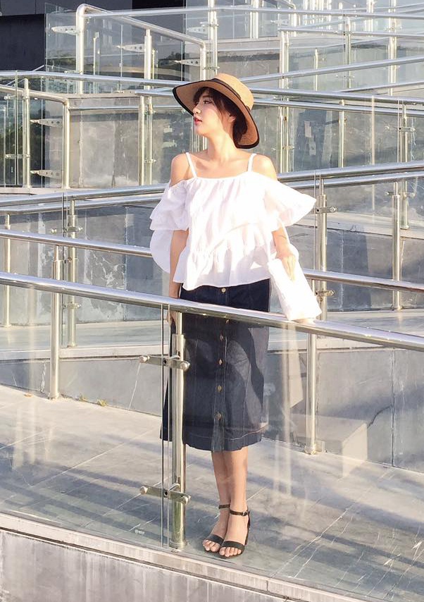 | Xu hướng cổ điển, nữ tính tiếp tục được Bùi Bích Phương duy trì. Trên trang cá nhân cô tự tin khoe set đồ áo trễ vai, chân váy cài cúc trước phóng khoáng và tươi trẻ. |