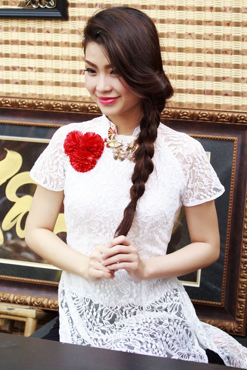 | Phương Linh chuộng gam màu nổi và chất liệu ren gợi cảm. Vì thế, nữ ca sĩ Hà thành đã chọn mẫu áo dài ren đính họa tiết hoa 3D hiện đại. Thiết kế tay ngắn và cổ thuyền rộng tạo cảm giác phóng khoáng cho kiểu mốt tân thời. |