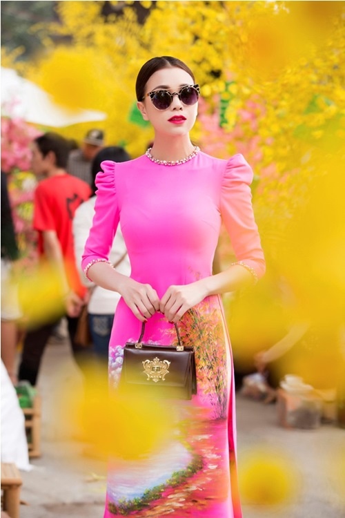 | Nổi bật giữa phố xuân Sài thành là hình ảnh Trà Ngọc Hằng trông sành diệu trong dáng áo dài hơi hướm tân thời. Phần cổ tay được làm bồng trong khi đó phom áo vẫn ôm sát cơ thể, mang nét đẹp nhẹ nhàng, thanh lịch khi thả bộ trên đường phố. |